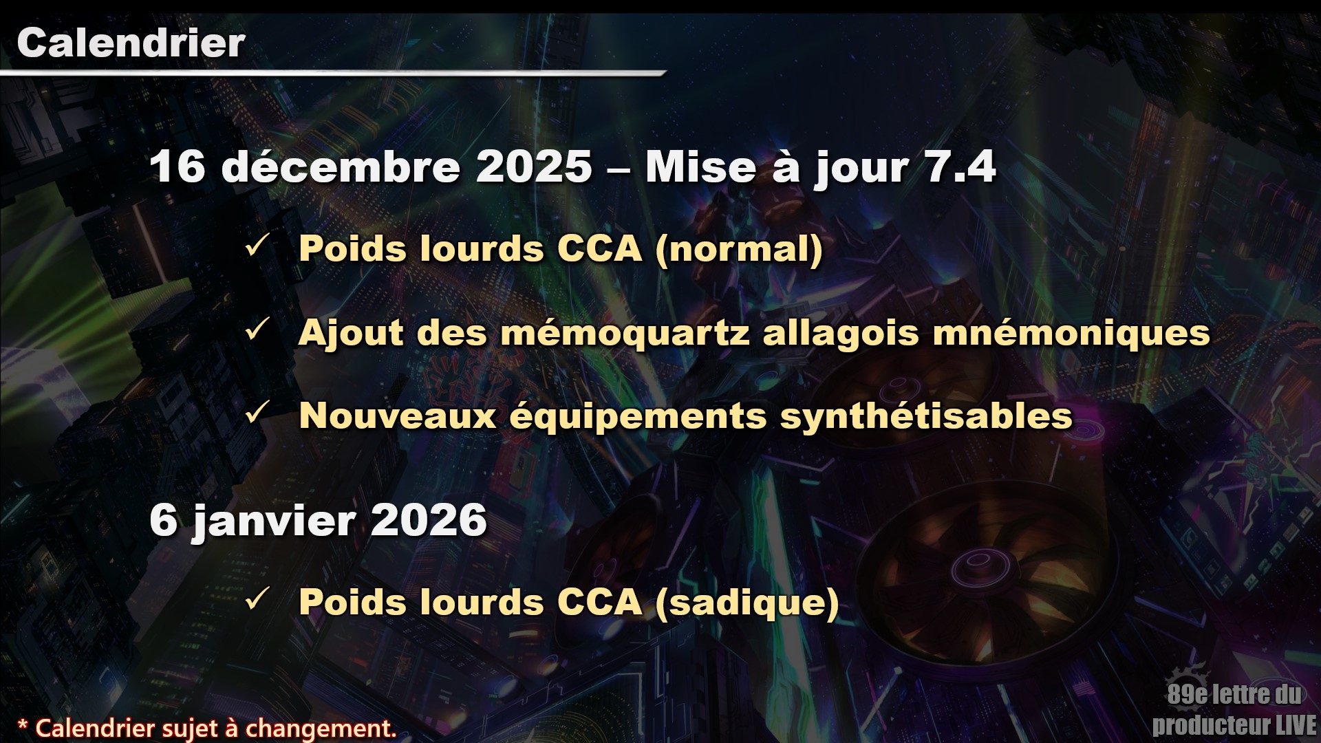 La dernière lettre du producteur a été diffusée hier dans la journée. Cette lettre a pour objet de commencer à présenter la mise à jour 7.4, intitulée "Into The Mist/dans la brume" dont la sortie est prévue pour le mardi 16 décembre 2025.