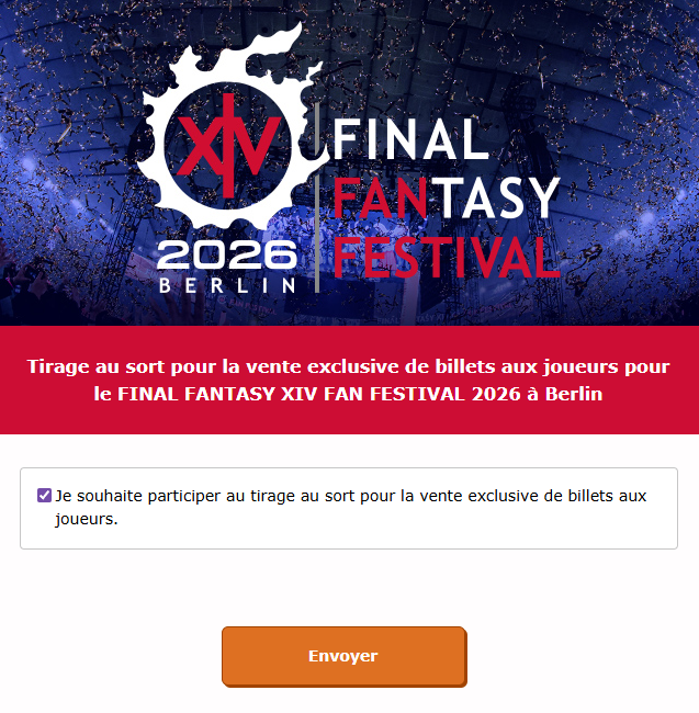 Le Final Fantasy XIV Fan Festival Européen se déroulera à Berlin les 25 et 26 Juillet 2026. Le FanFest affiche généralement complet, et cette loterie réservée exclusivement aux joueurs actifs ayant un compte Européen est le meilleur moyen d'obtenir votre précieux billet.